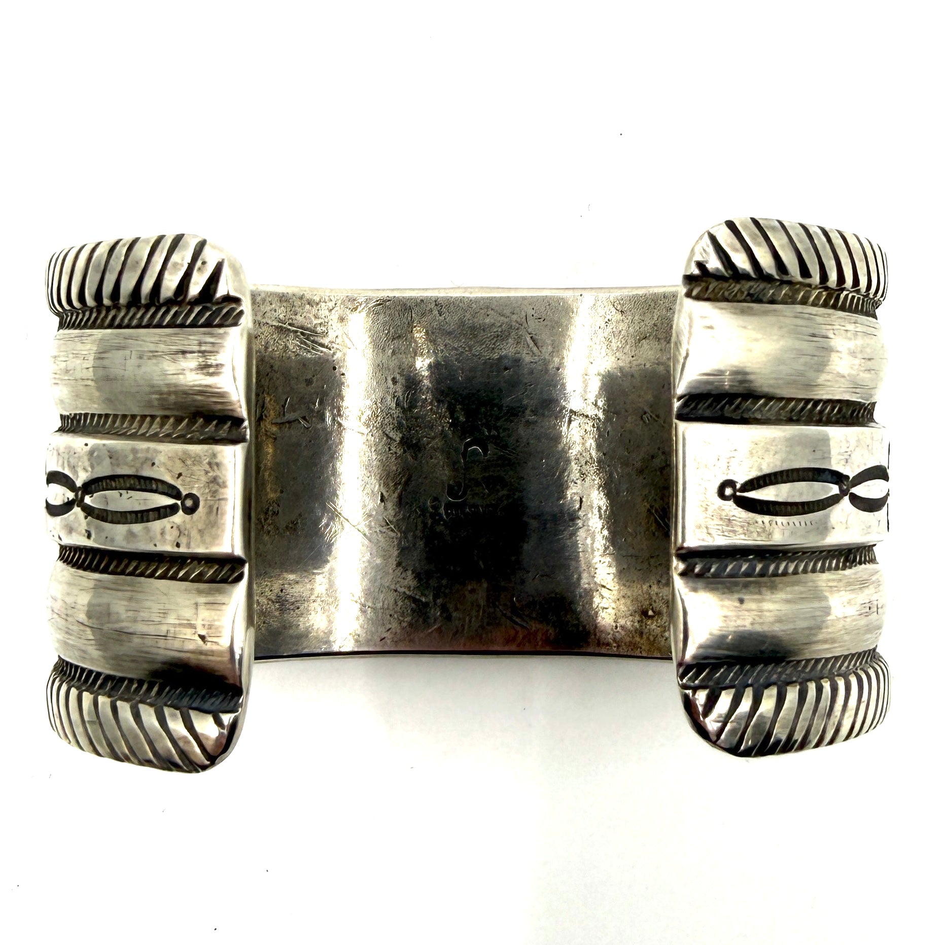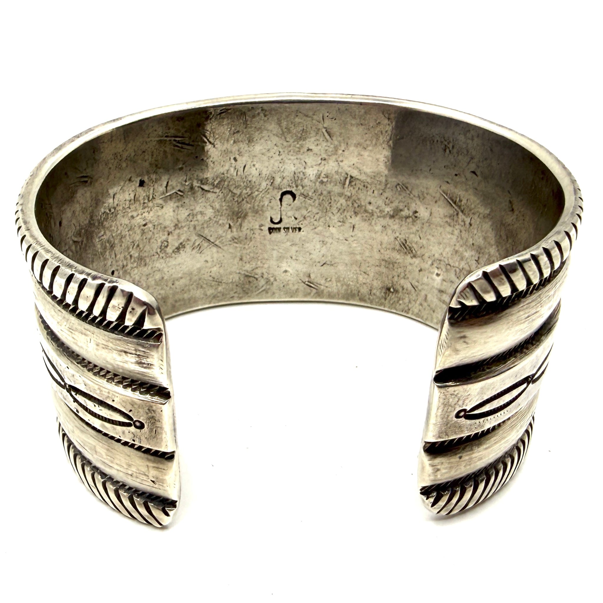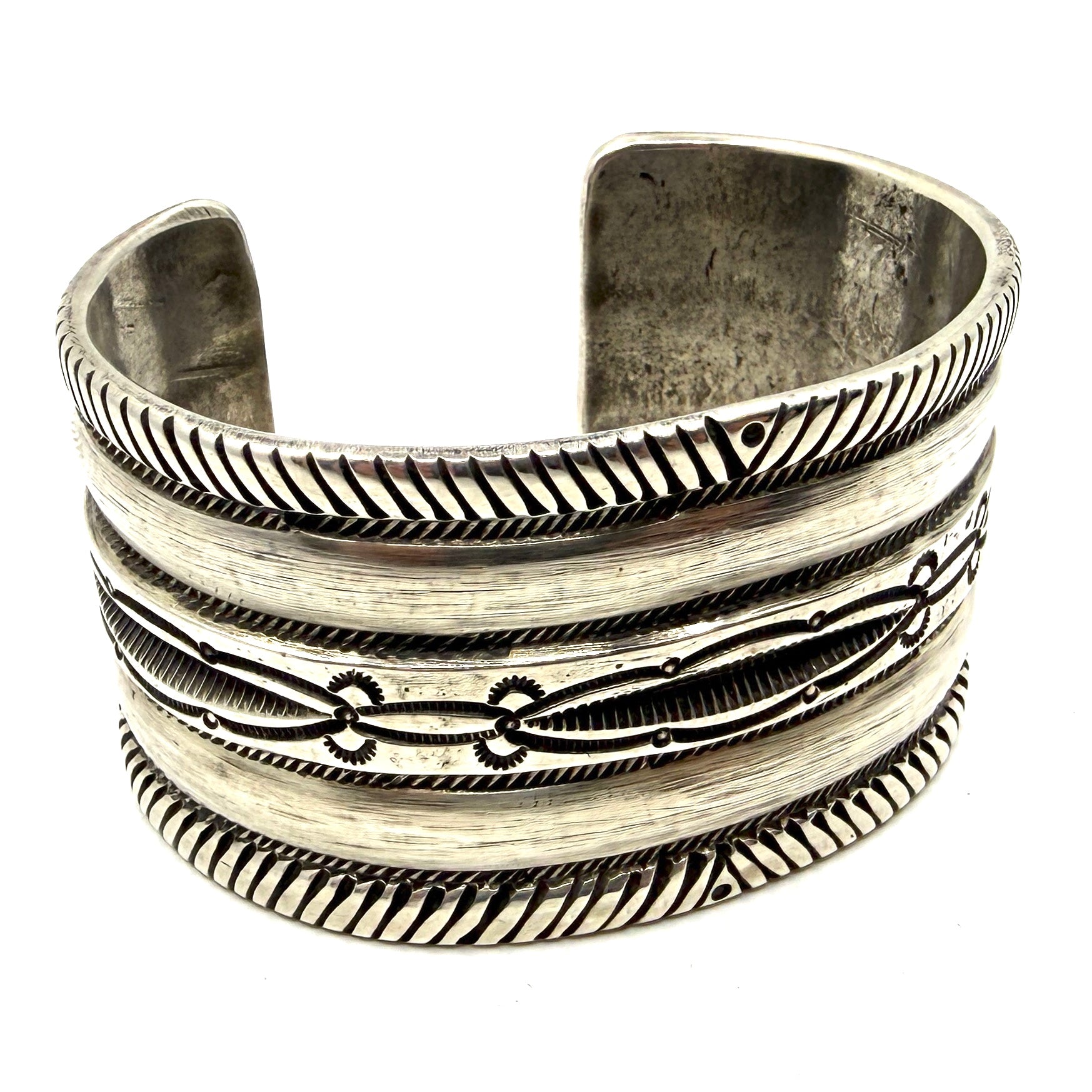 This is a heavy stamped and filed two rope cuff. Size: 6" Inside to Inside. 1 1/8" Opening. 1 1/8" Wide.