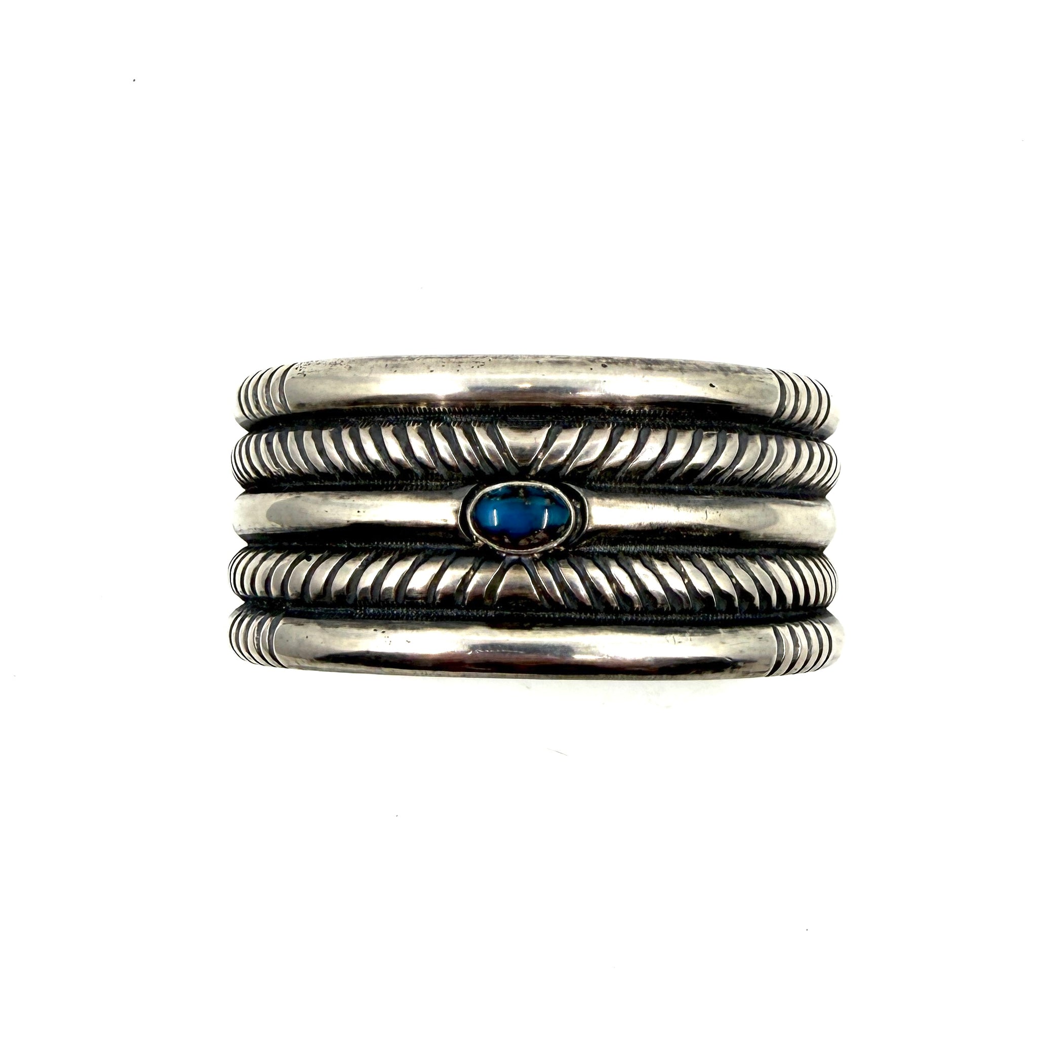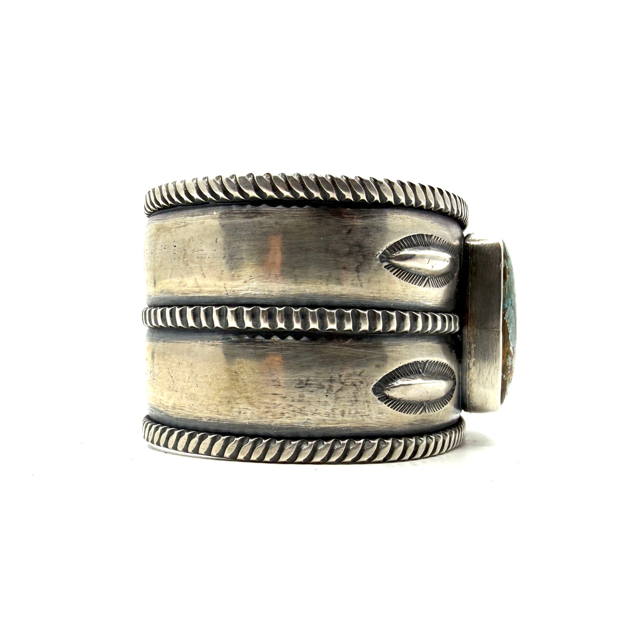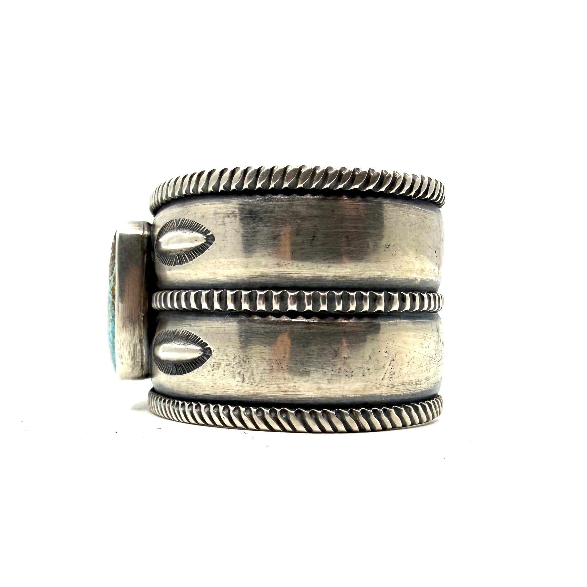 Heavy Coin Silver Three Rope Stamped Repoussé Cuff with Poquito Ridge Turquoise