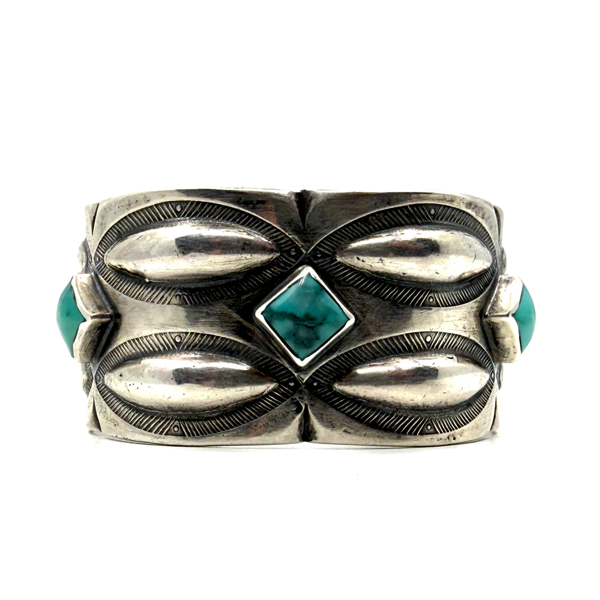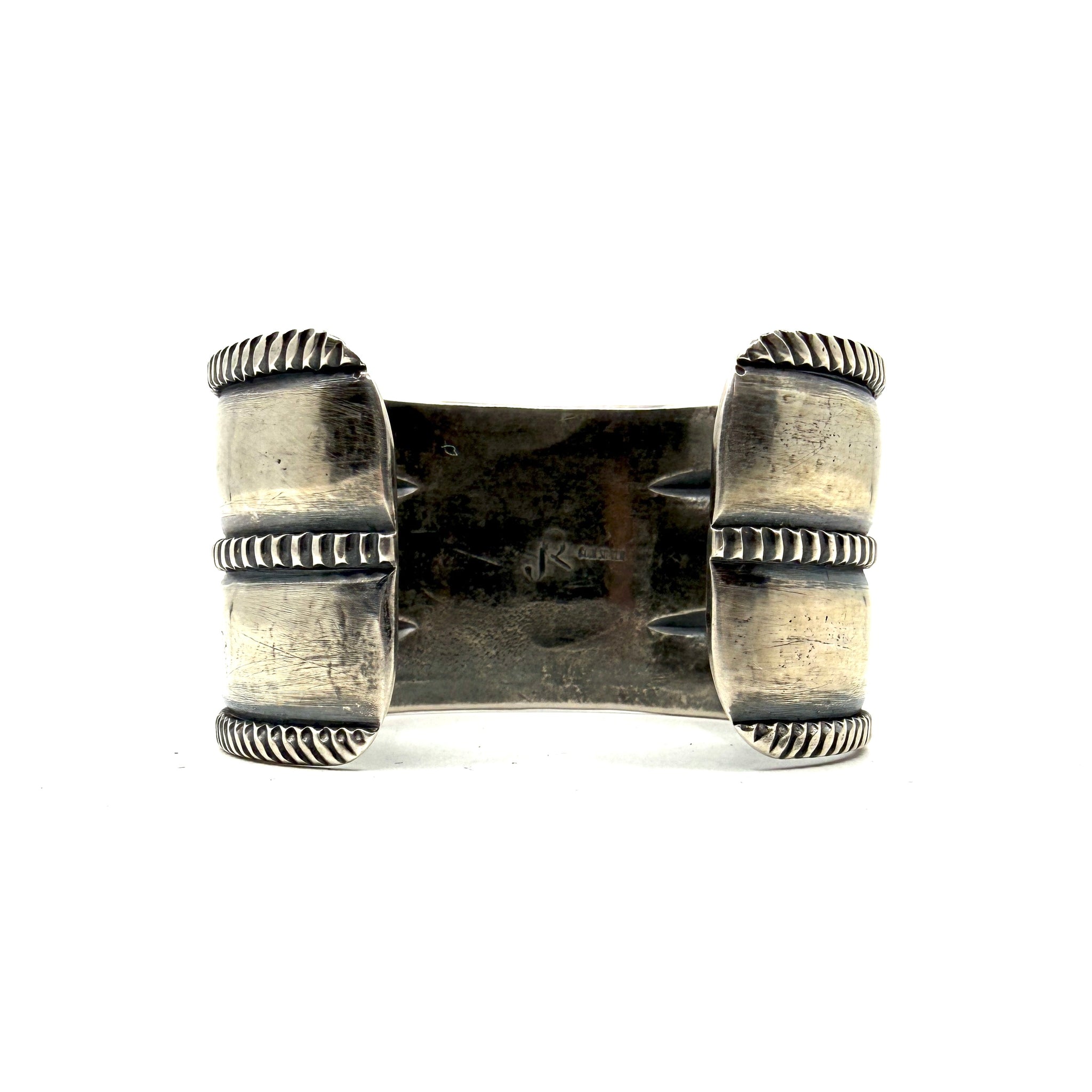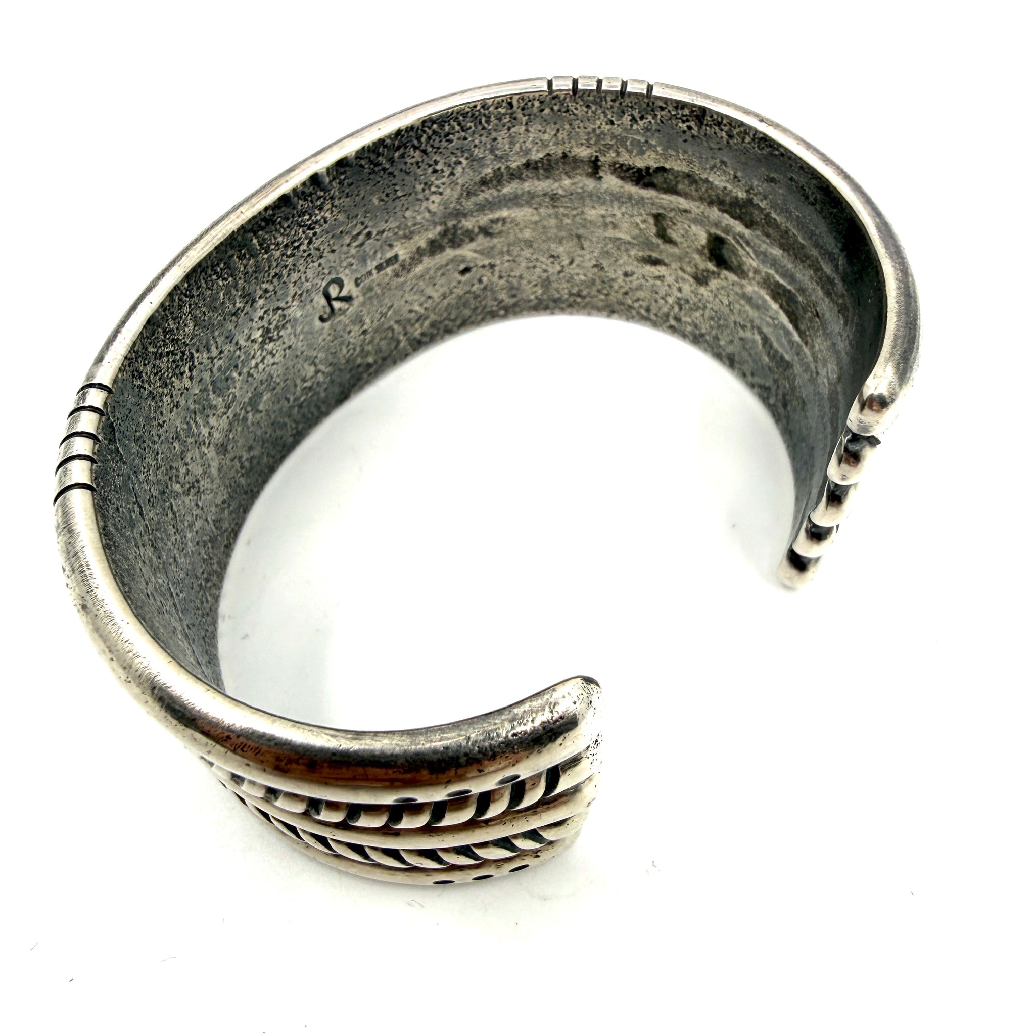 Heavy Coin Silver Three Rope Stamped Repoussé Cuff with Poquito Ridge Turquoise