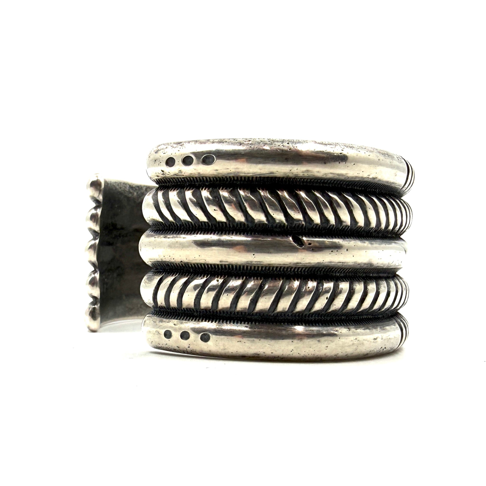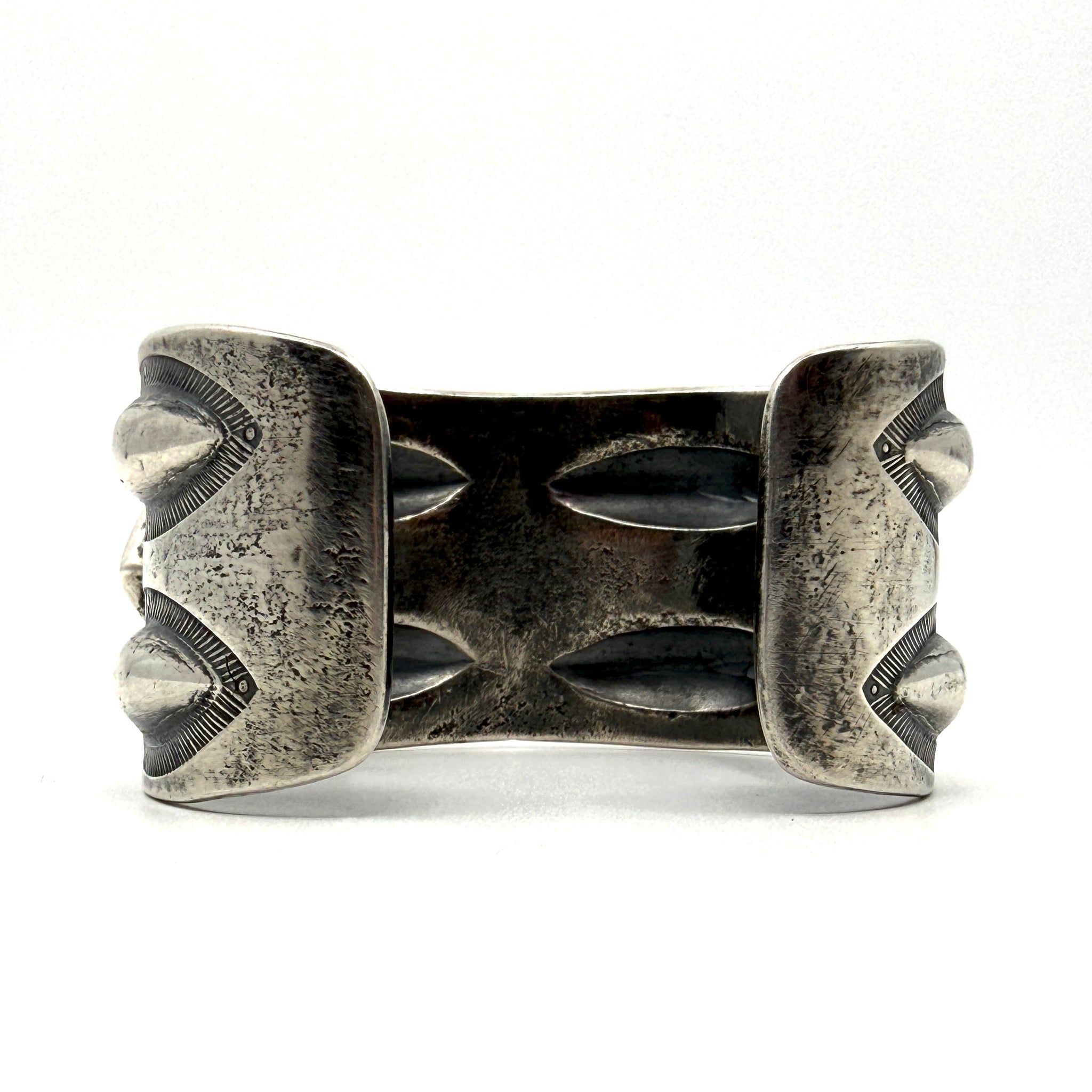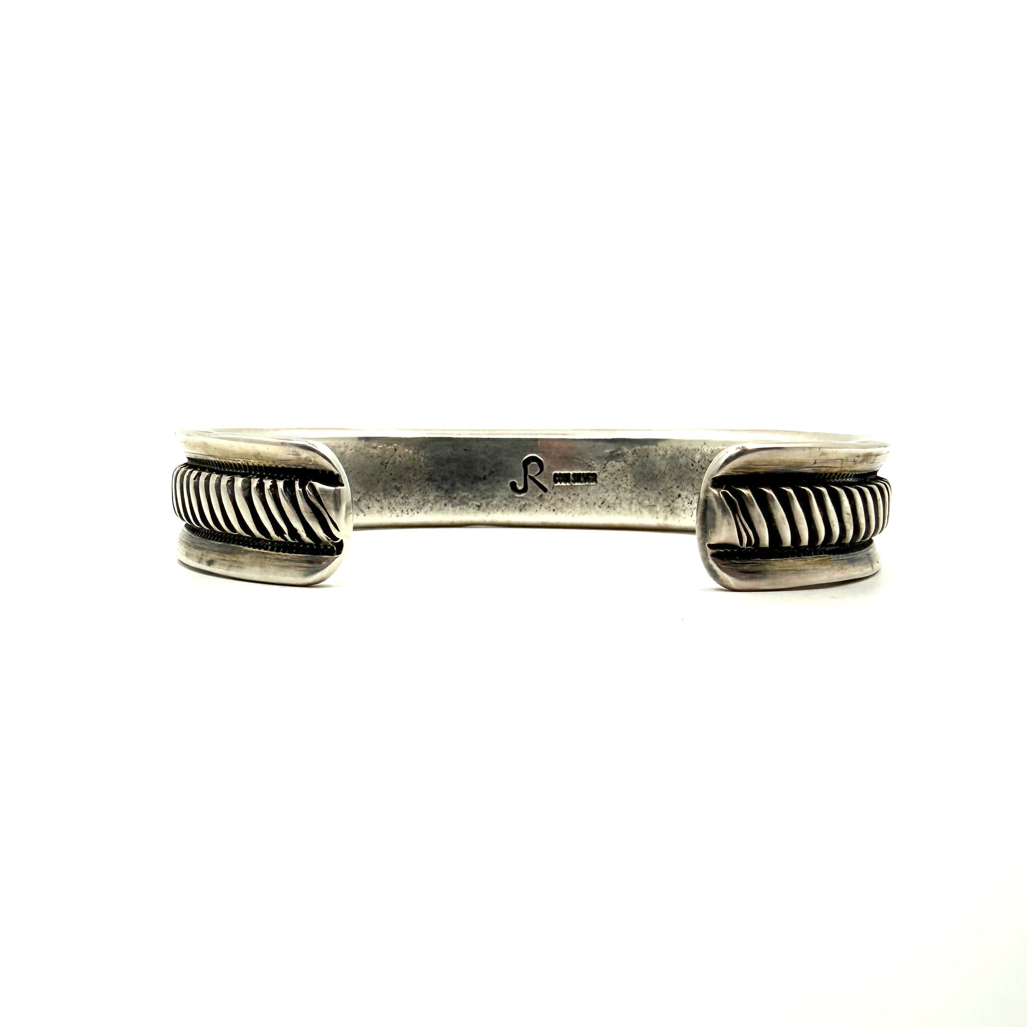 Coin silver ingot bracelet that is stamped, filed and chased.