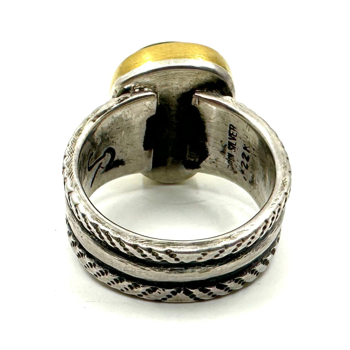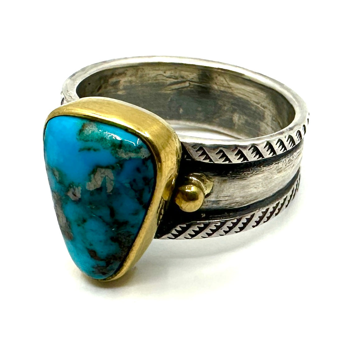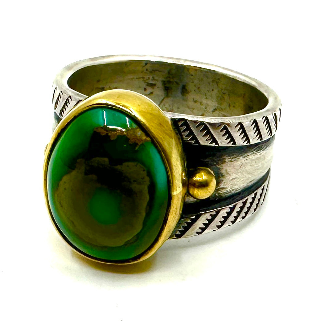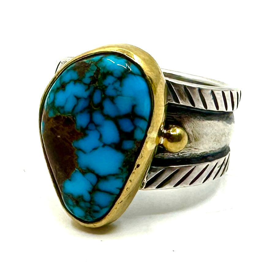 This stunning piece of Royston Turquoise is set in a 22k gold bezel. It features a coin silver ingot band that tapers from 7/16" to 5/16".