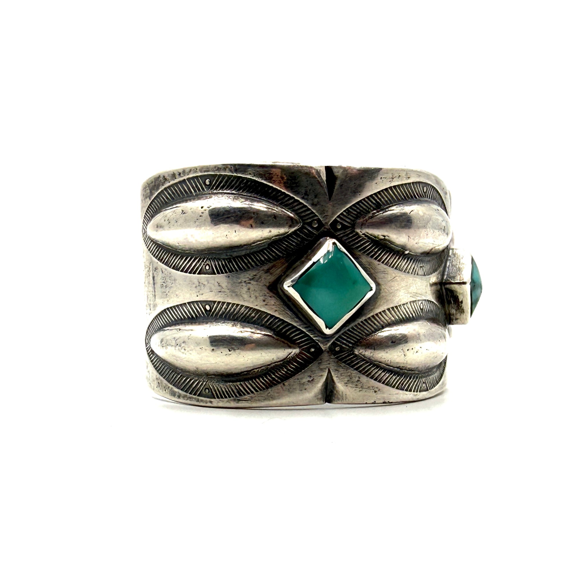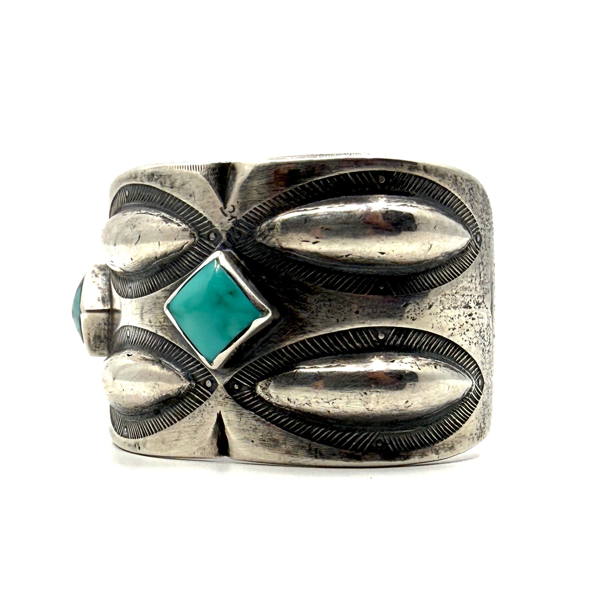 This tufa cast coin silver ingot cuff features classic repousse and stamp work. accenting the cuff is a Harcross Turquoise stone. Size: 5 1/2" inside tip to tip with a...
