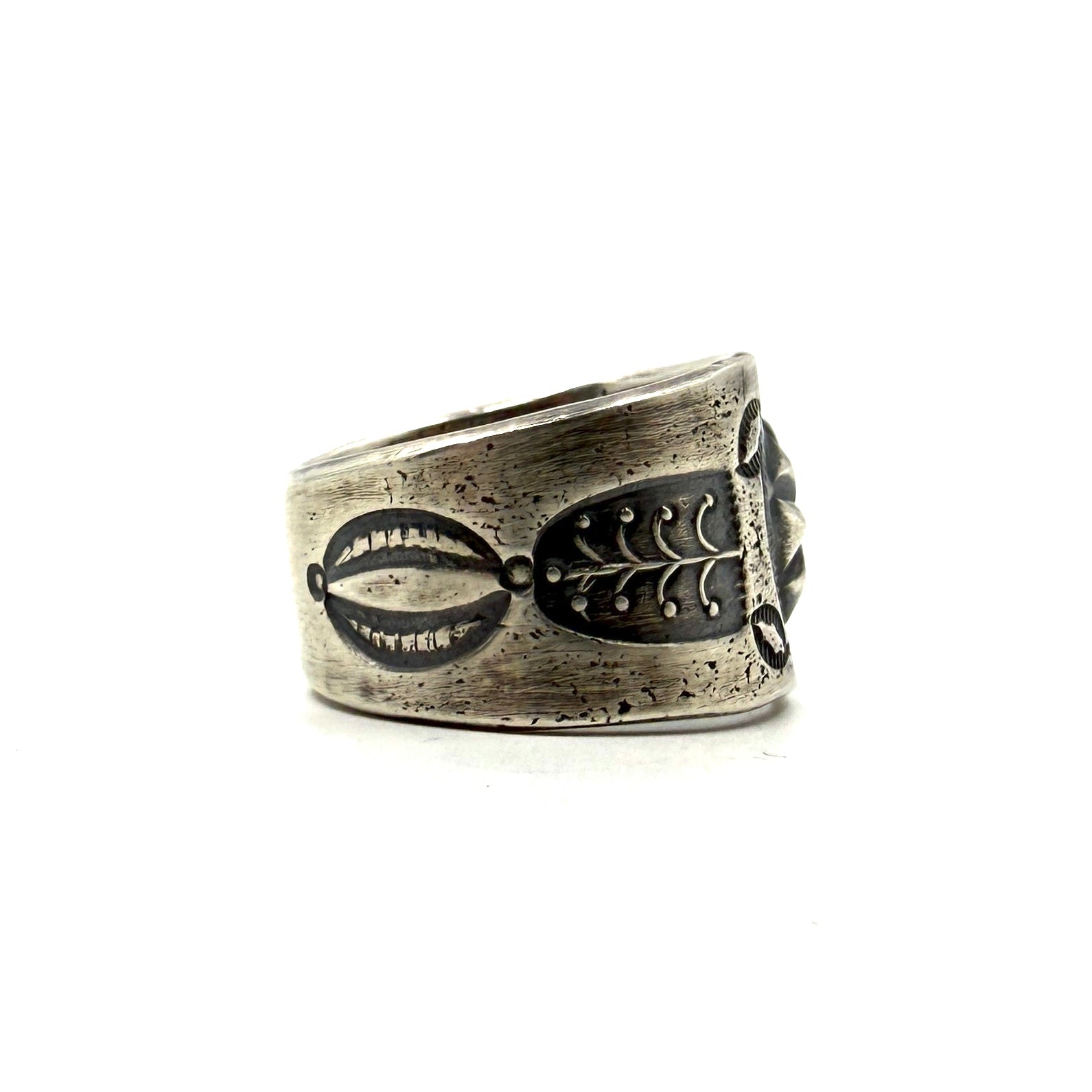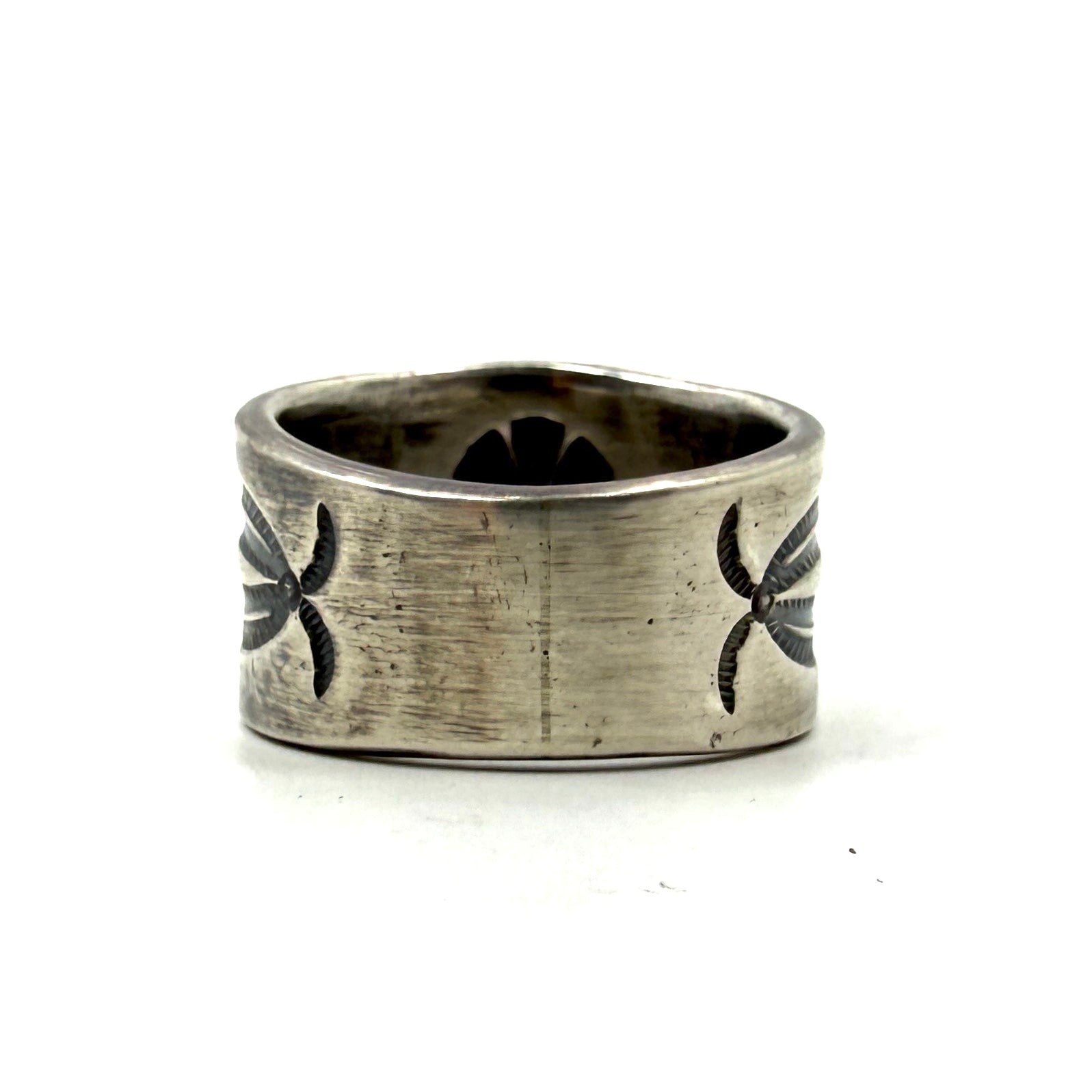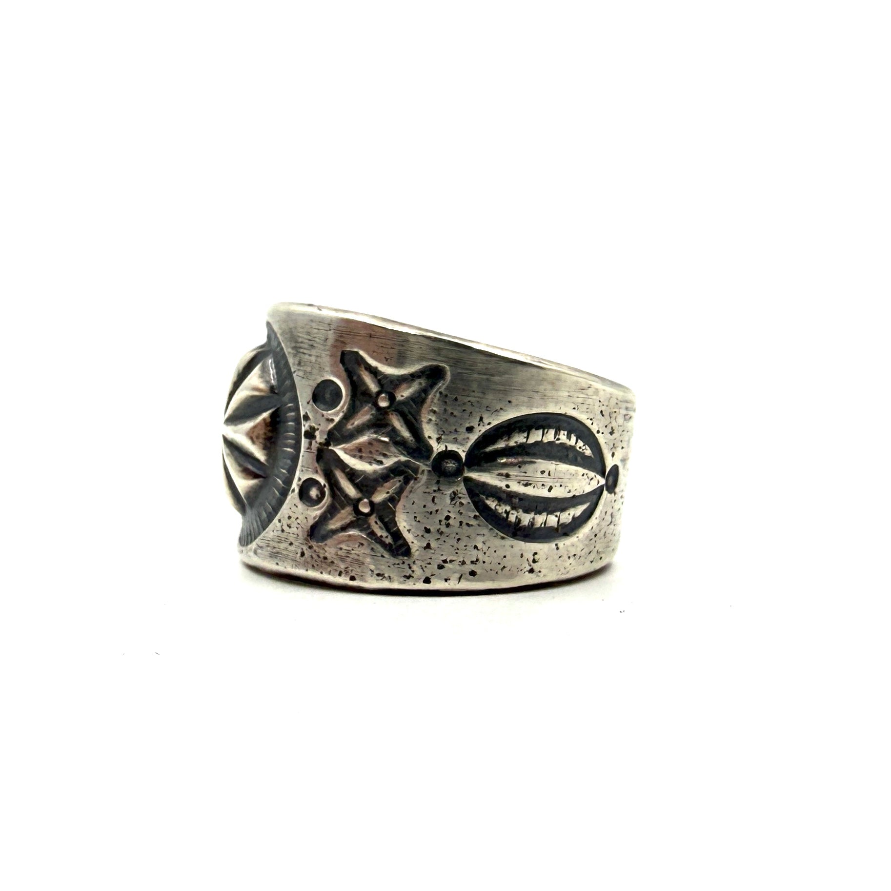 Tufa cast coin silver ingot ring with bump up repoussé and stamp work.