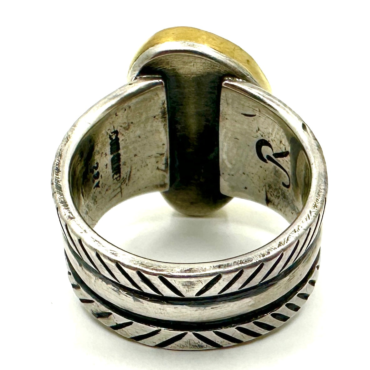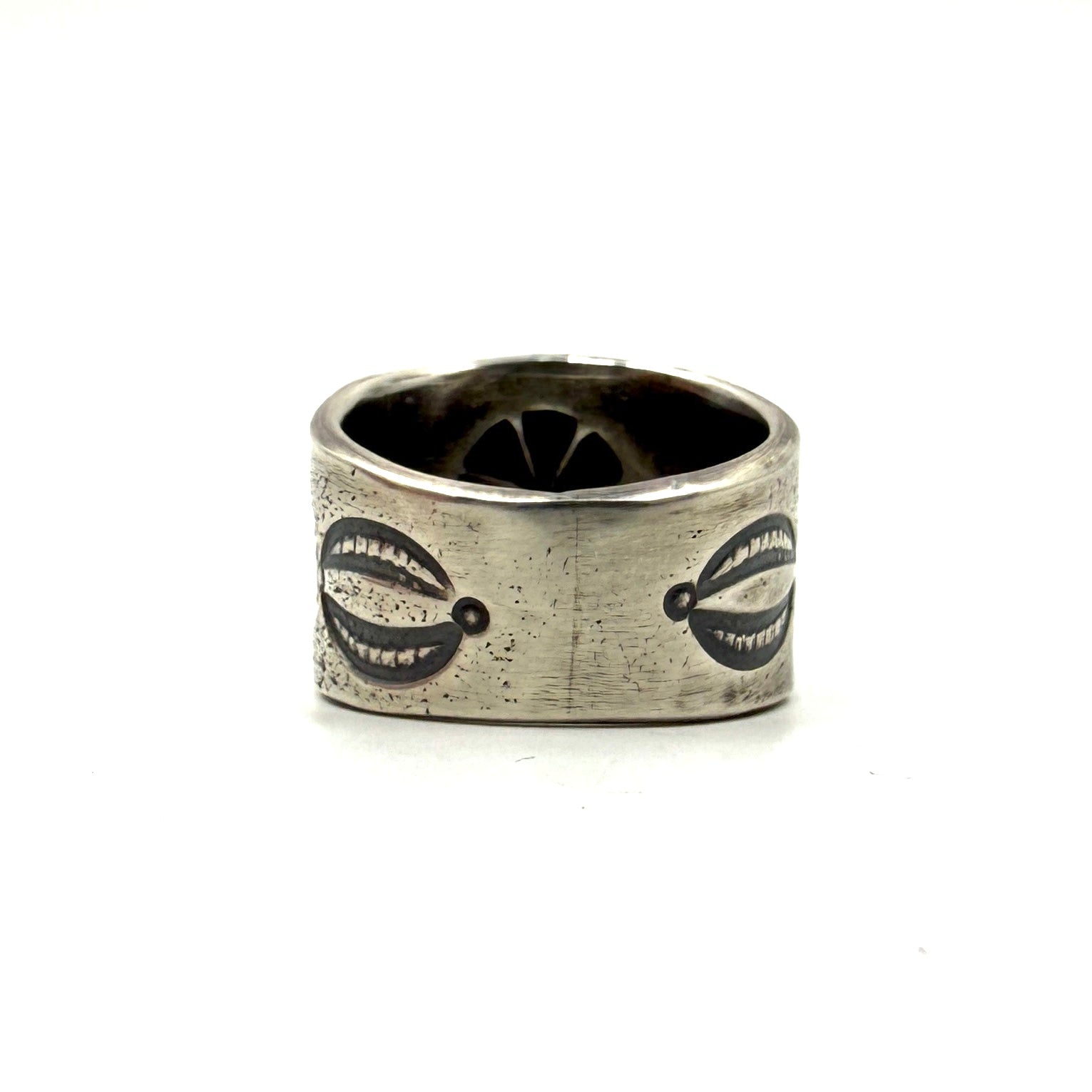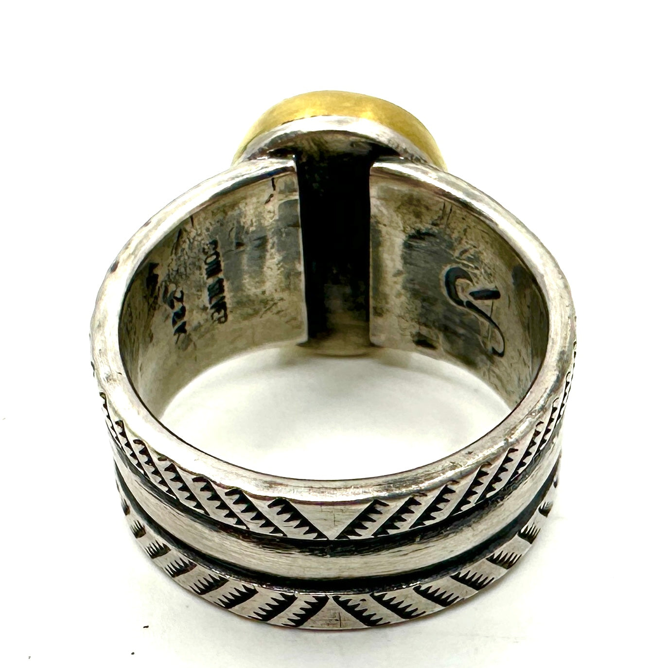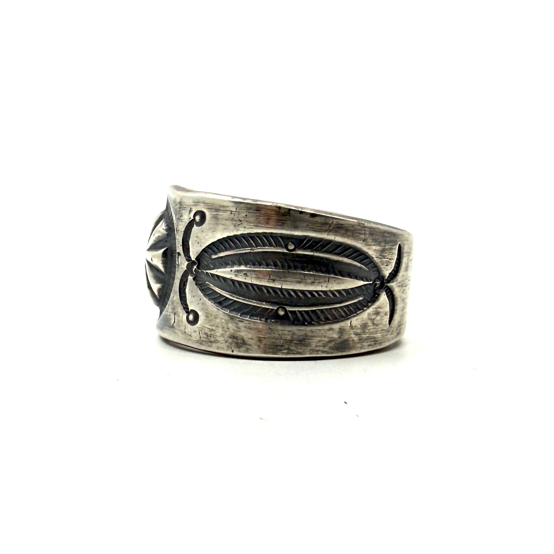 Tufa cast coin silver ingot ring with bump up repoussé and stamp work.