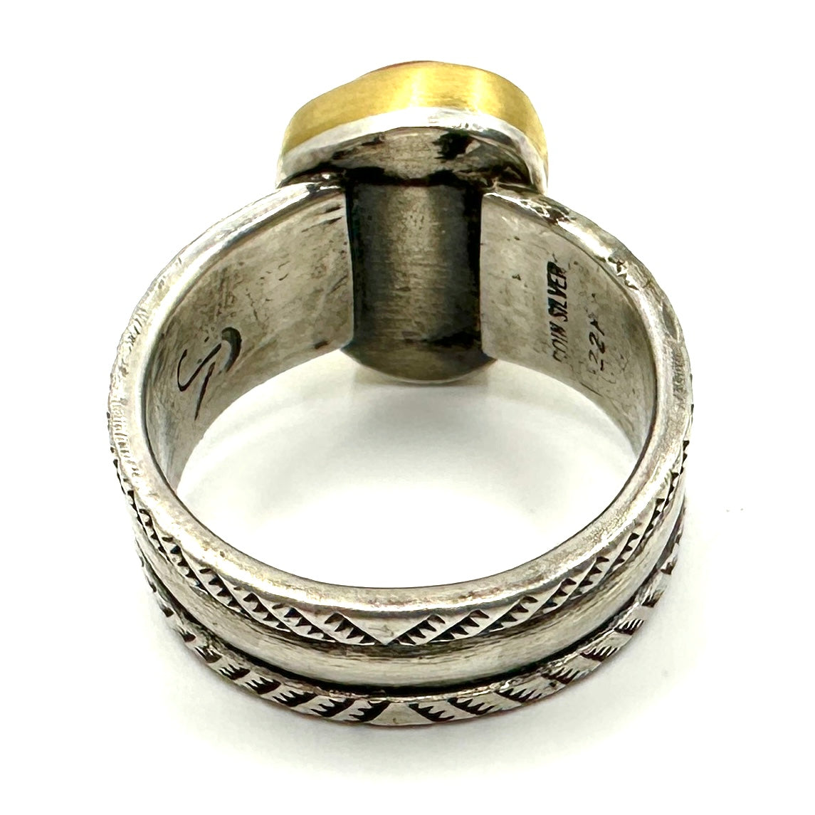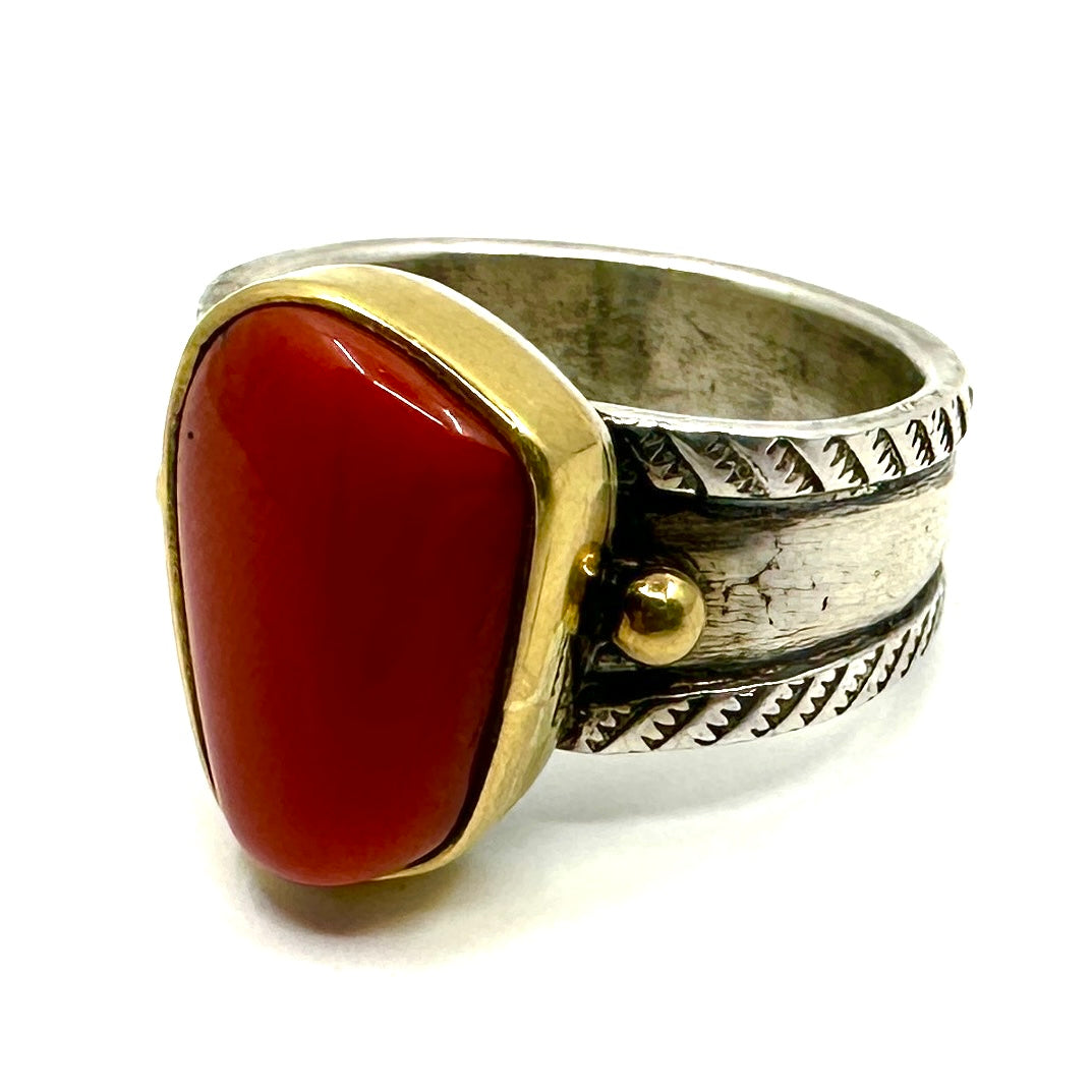 This stunning piece of Mediterranean Coral is set in a 22k gold bezel. It features a coin silver ingot band that tapers from 5/16" to 1/4".