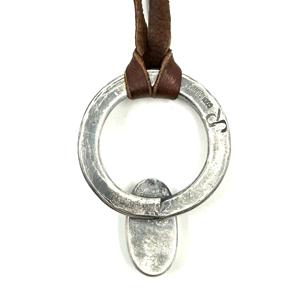 This Jesse Robbins tufa cast coin silver ingot pendant features a Poquito Ridge Turquoise stone. Strung on hand-cut deer lace with a silver adjuster bead. Size: 1-1/2" by 1". Leather...
