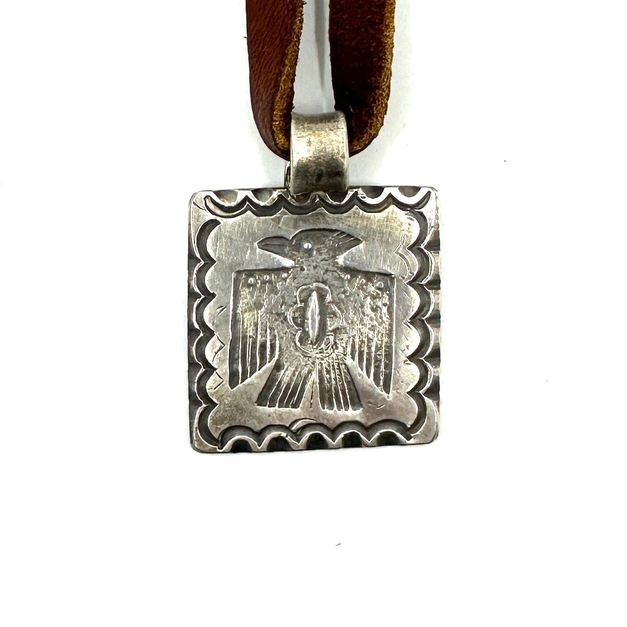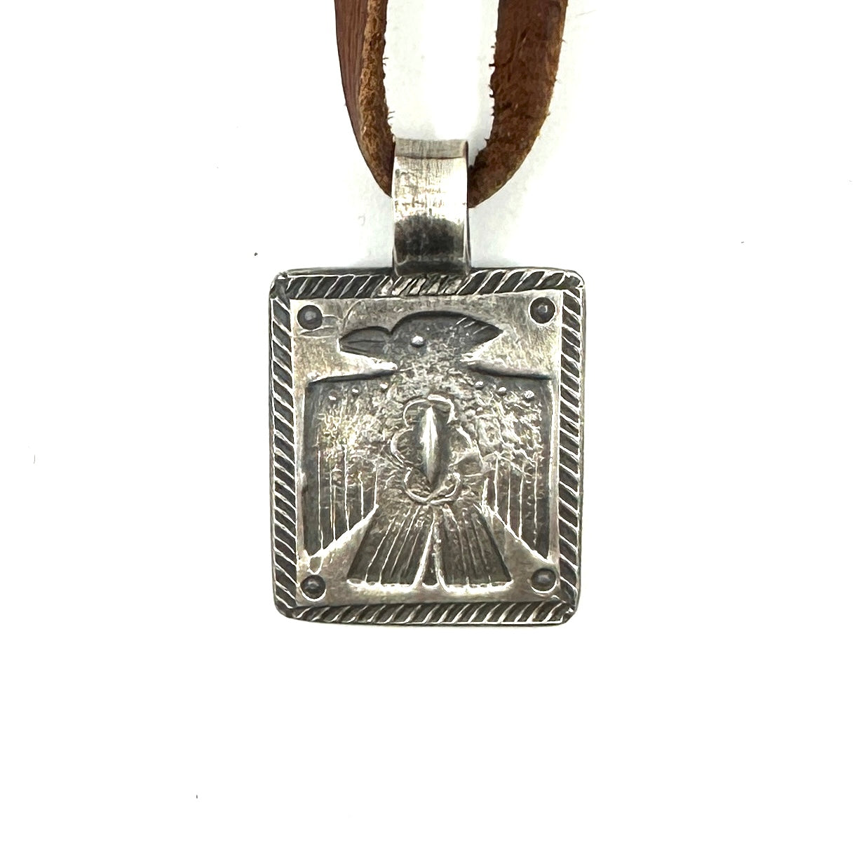 This is a new tufa cast coin silver ingot traveler pendant features a coin silver Thunderbird plaque made from a new stamp in the Jesse Robbins collection. Strung on hand-cut...