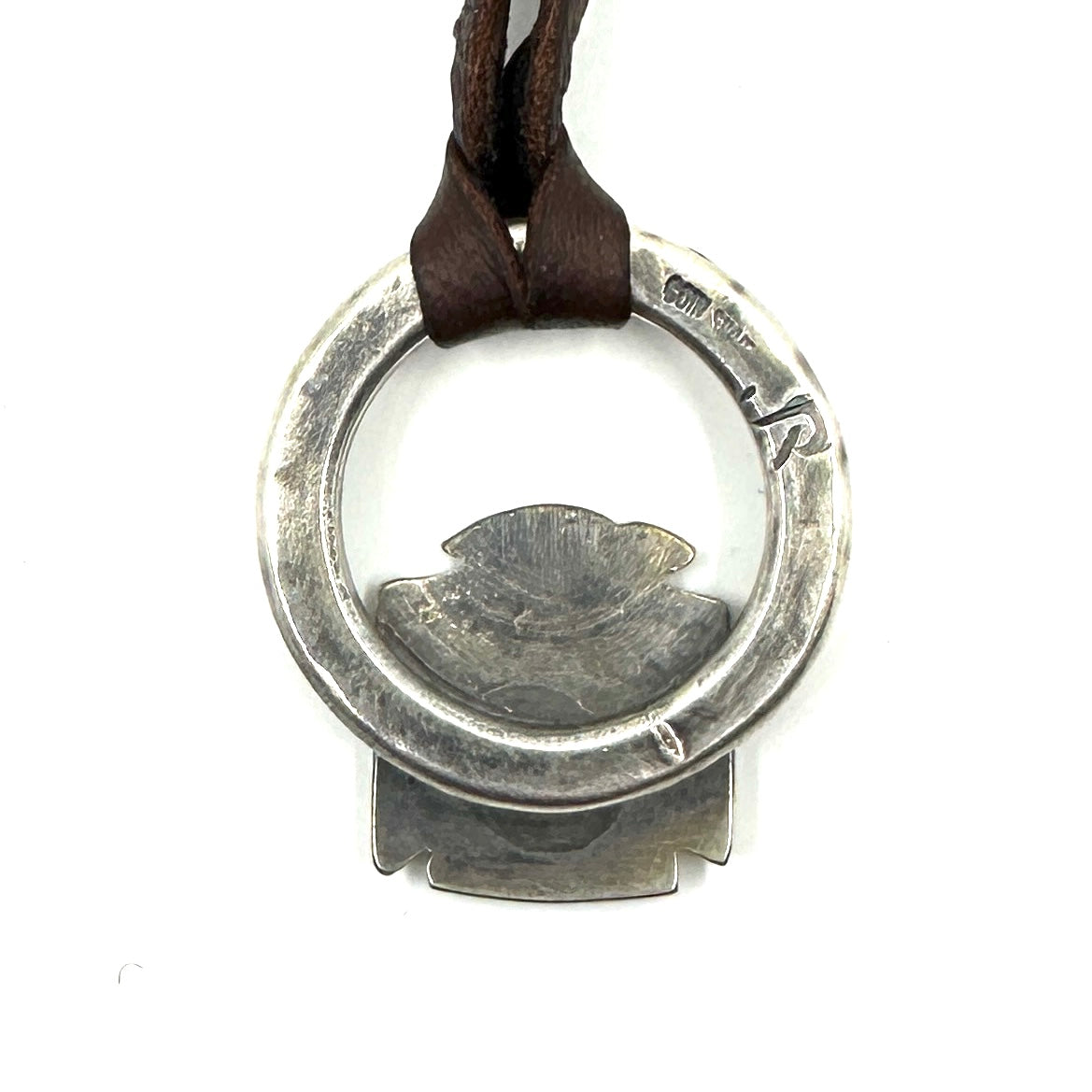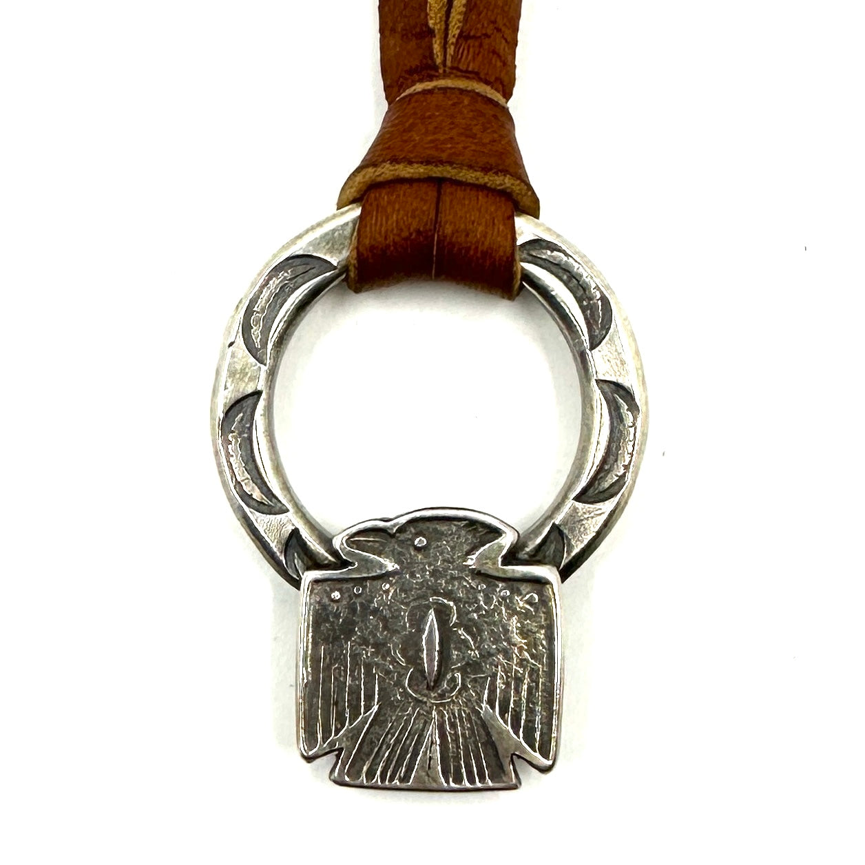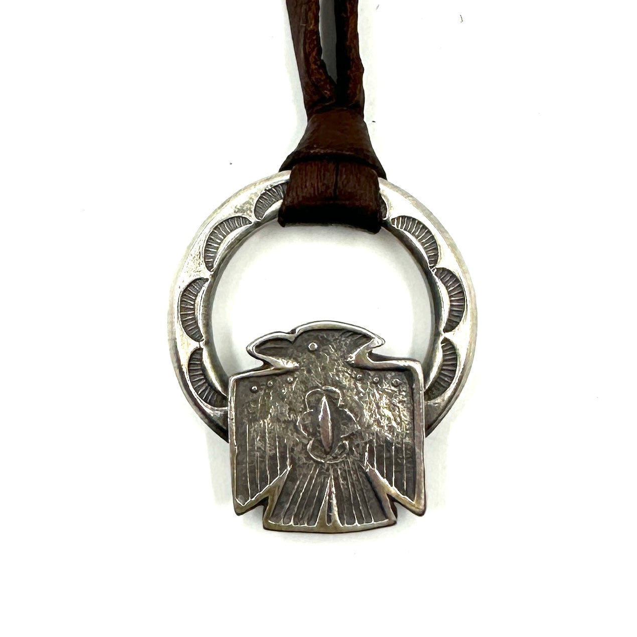 This Thunderbird Pendant is made from hand rolled coin silver ingot and is strung on hand cut deer lace accented with a silver adjustment bead. Thunderbird Size: 1 1/2" wide by...
