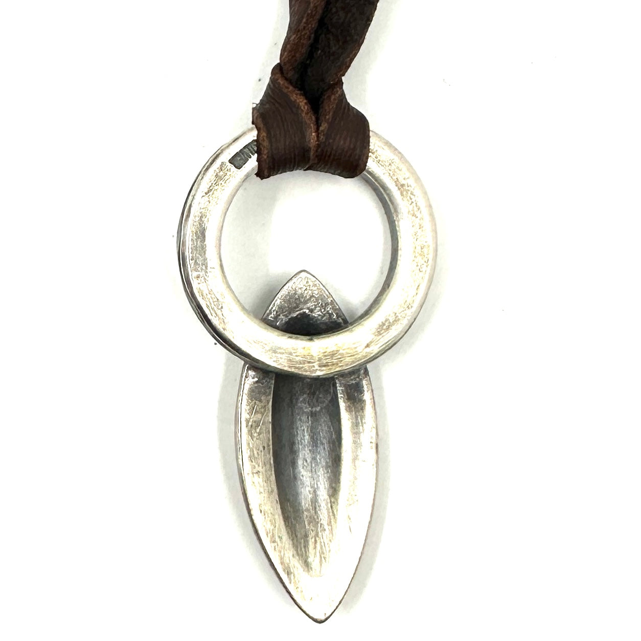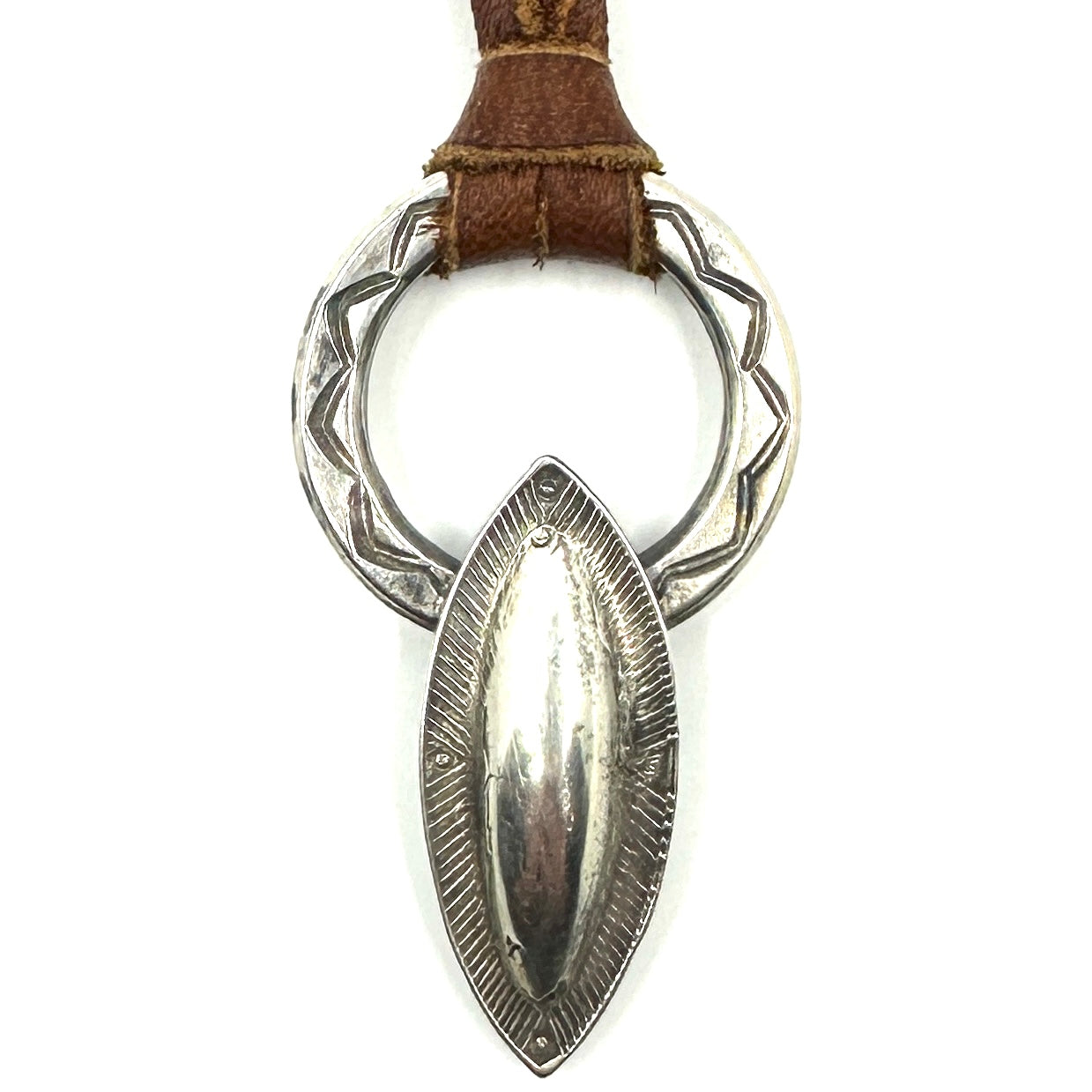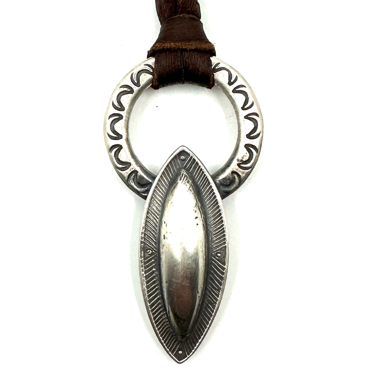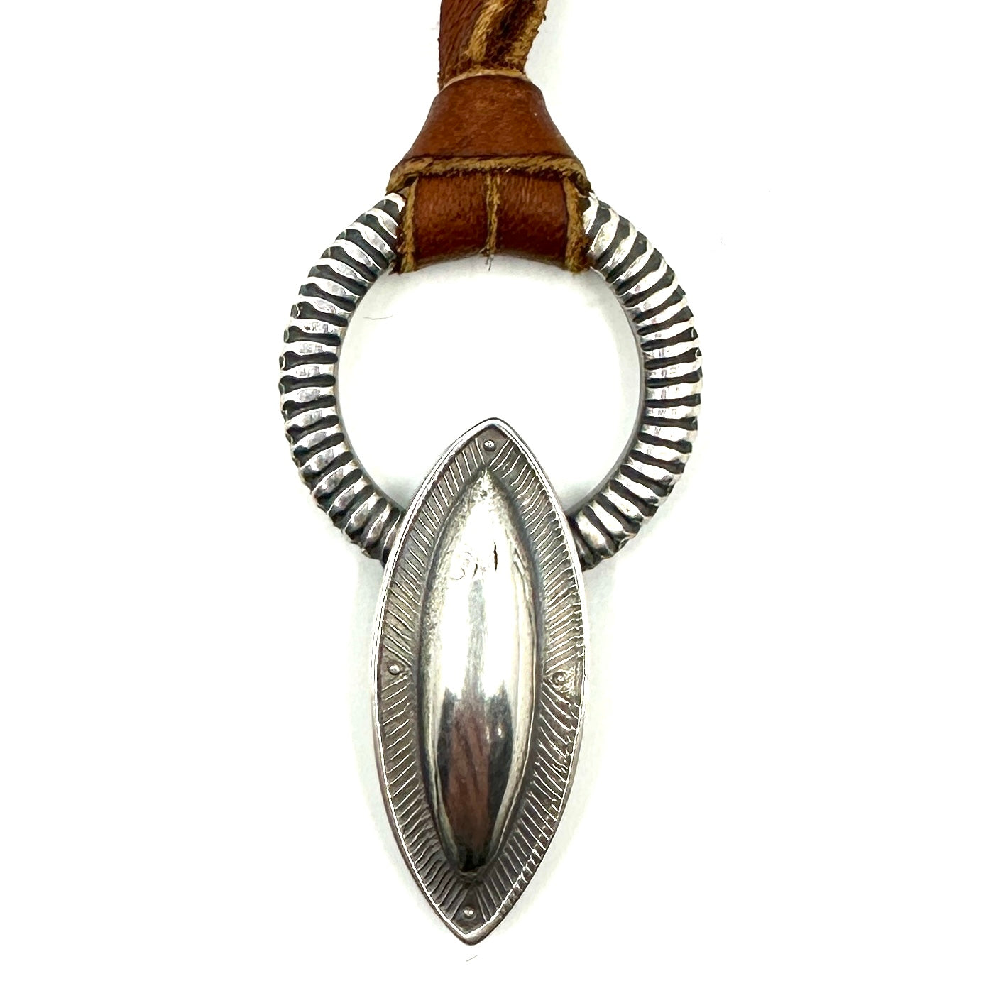 This Thunderbird Pendant is made from hand rolled coin silver ingot and is strung on hand cut deer lace accented with a silver adjustment bead. Thunderbird Size: 1 1/2" wide by...