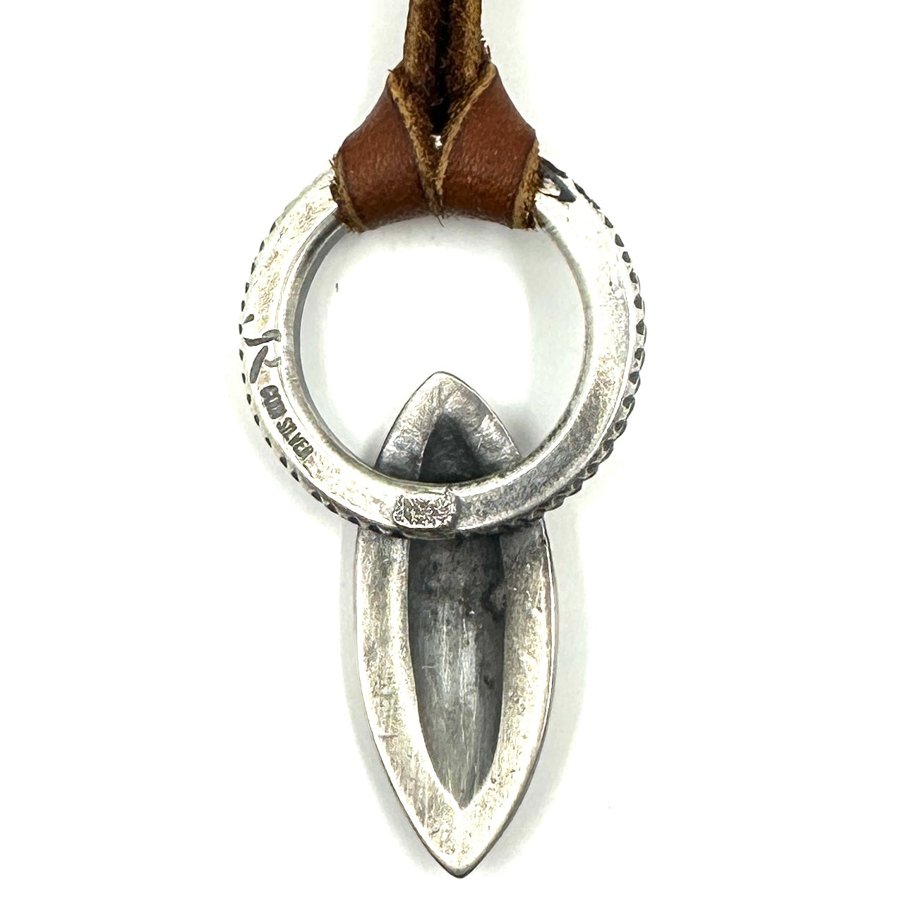 This Thunderbird Pendant has a beautiful Bisbee turquoise stone. This is hand rolled from a coin silver ingot and is strung on hand cut deer lace accented with a silver...