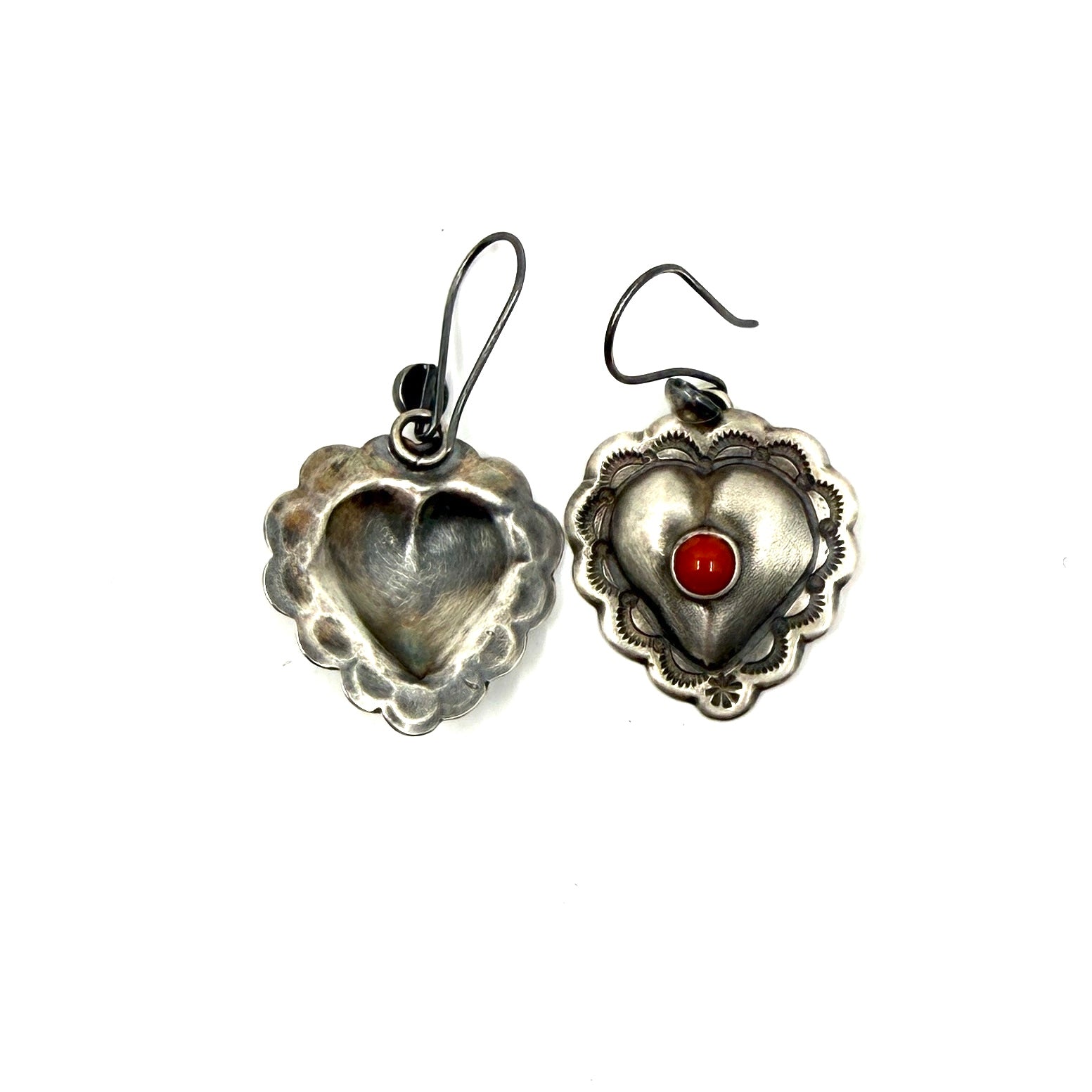 Coin silver ingot heart earrings with a Coral stone in the center. Size: 1" x 1"