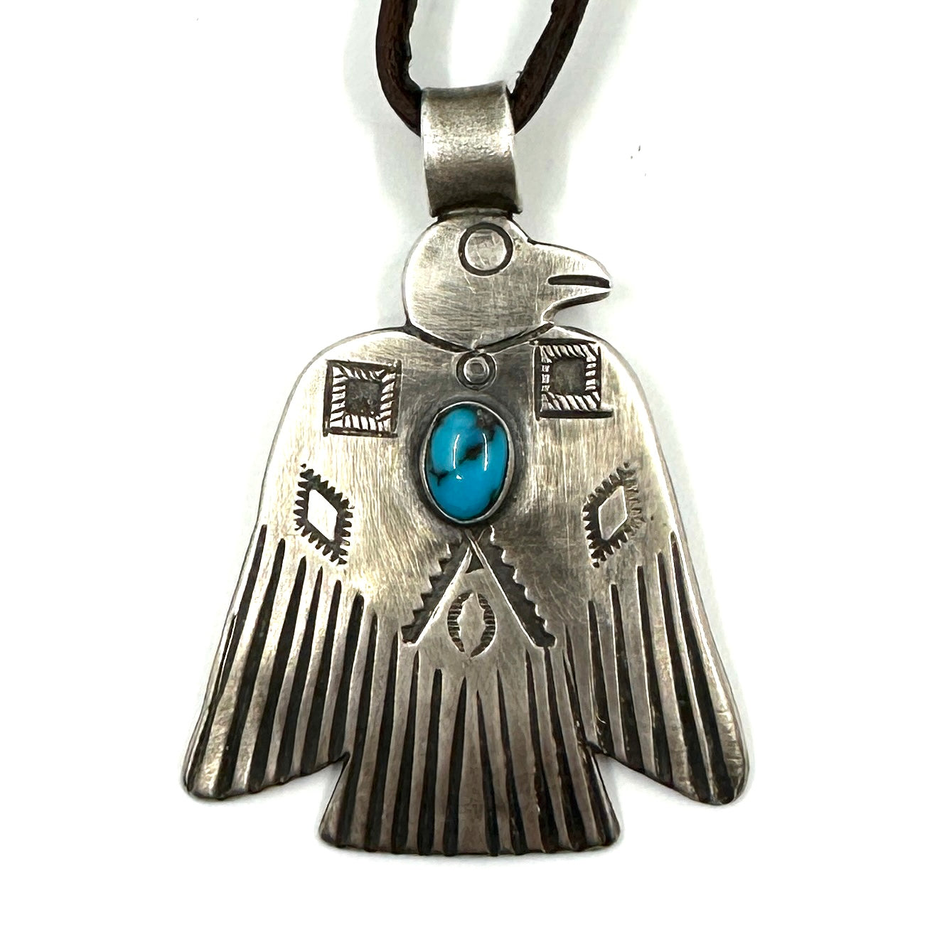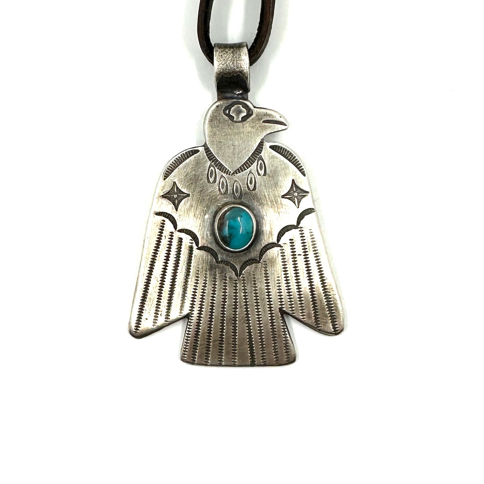 This Thunderbird Pendant has a beautiful Bisbee turquoise stone. This is hand rolled from a coin silver ingot and is strung on hand cut deer lace accented with a silver...