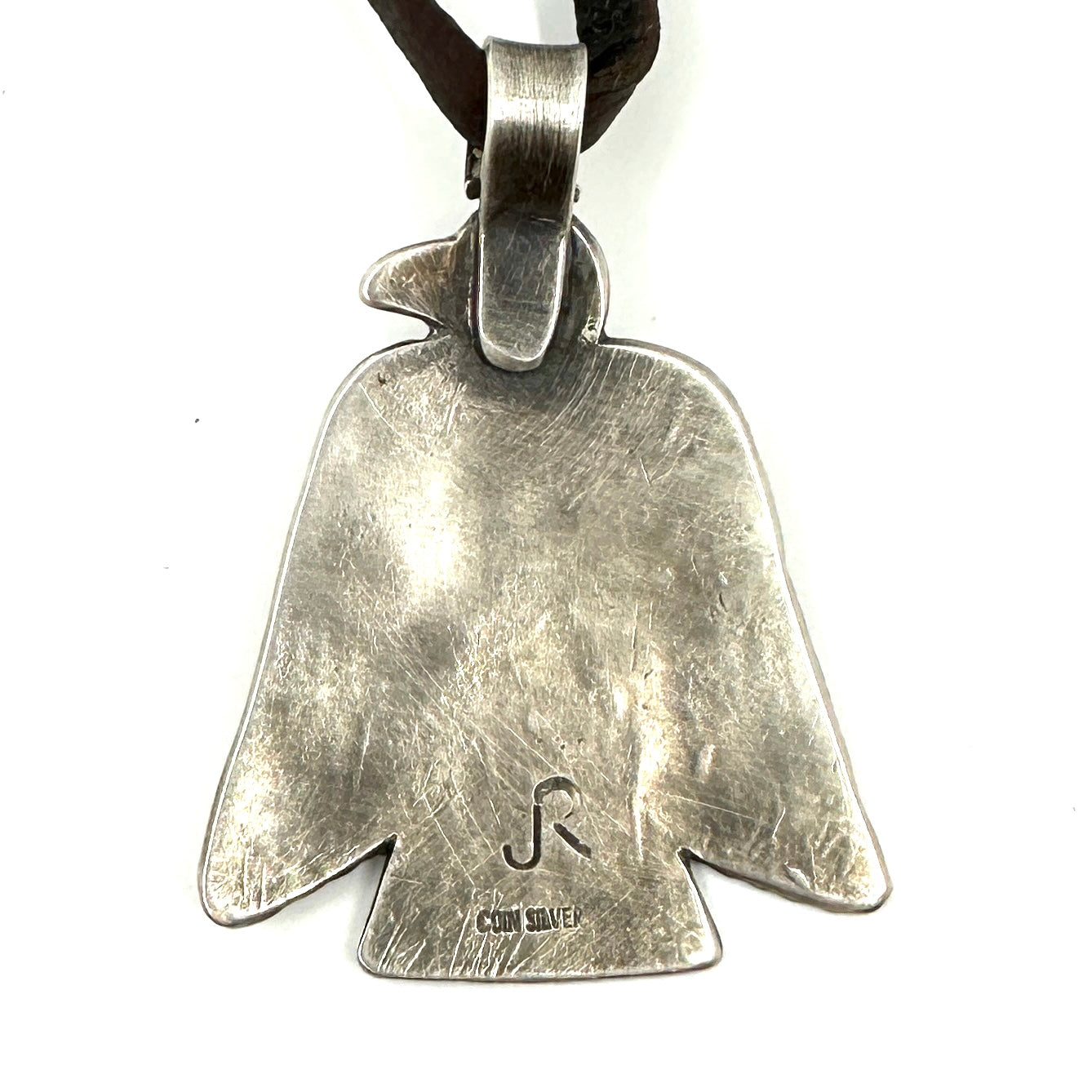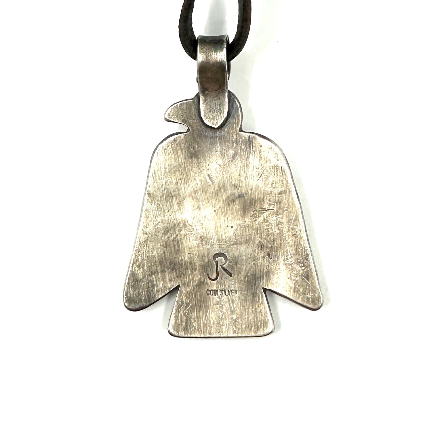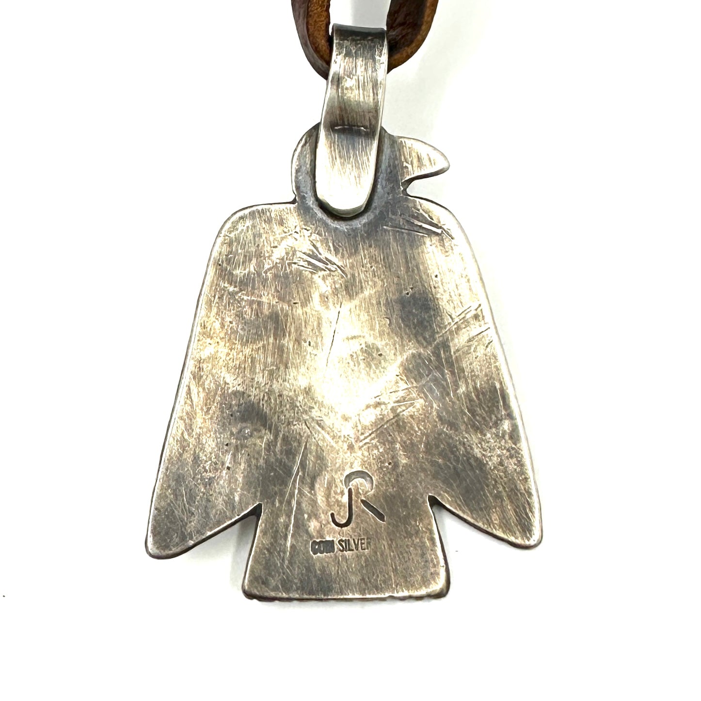 This Thunderbird Pendant is made from hand rolled coin silver ingot and is strung on hand cut deer lace accented with a silver adjustment bead. Thunderbird Size: 1 1/2" wide by...