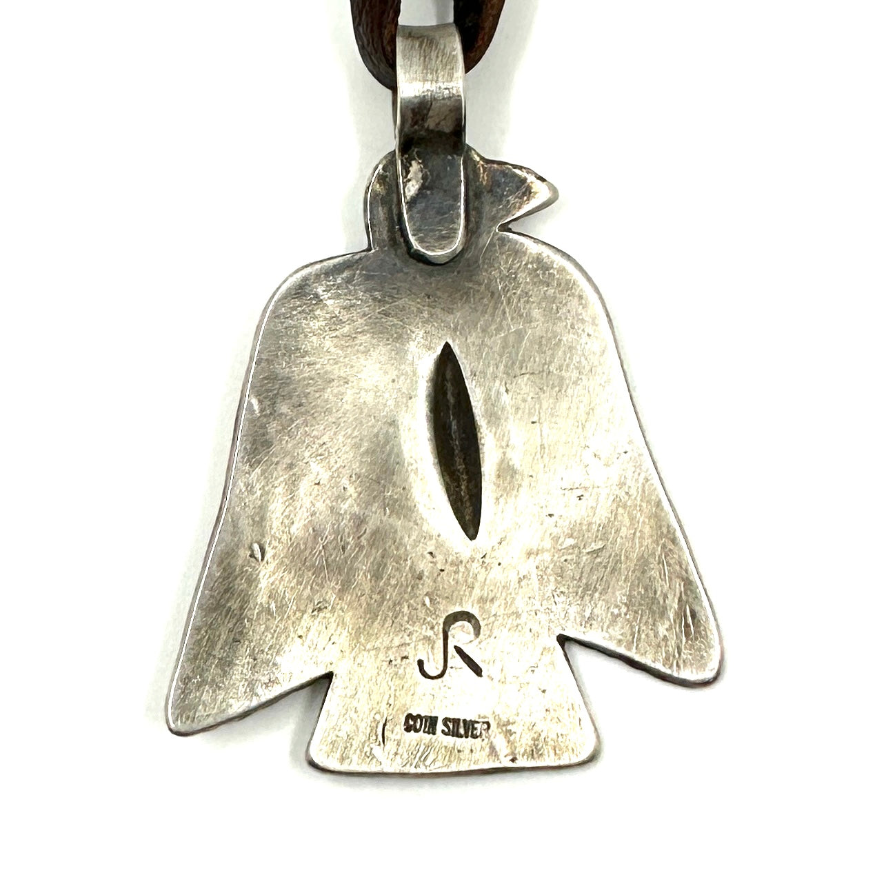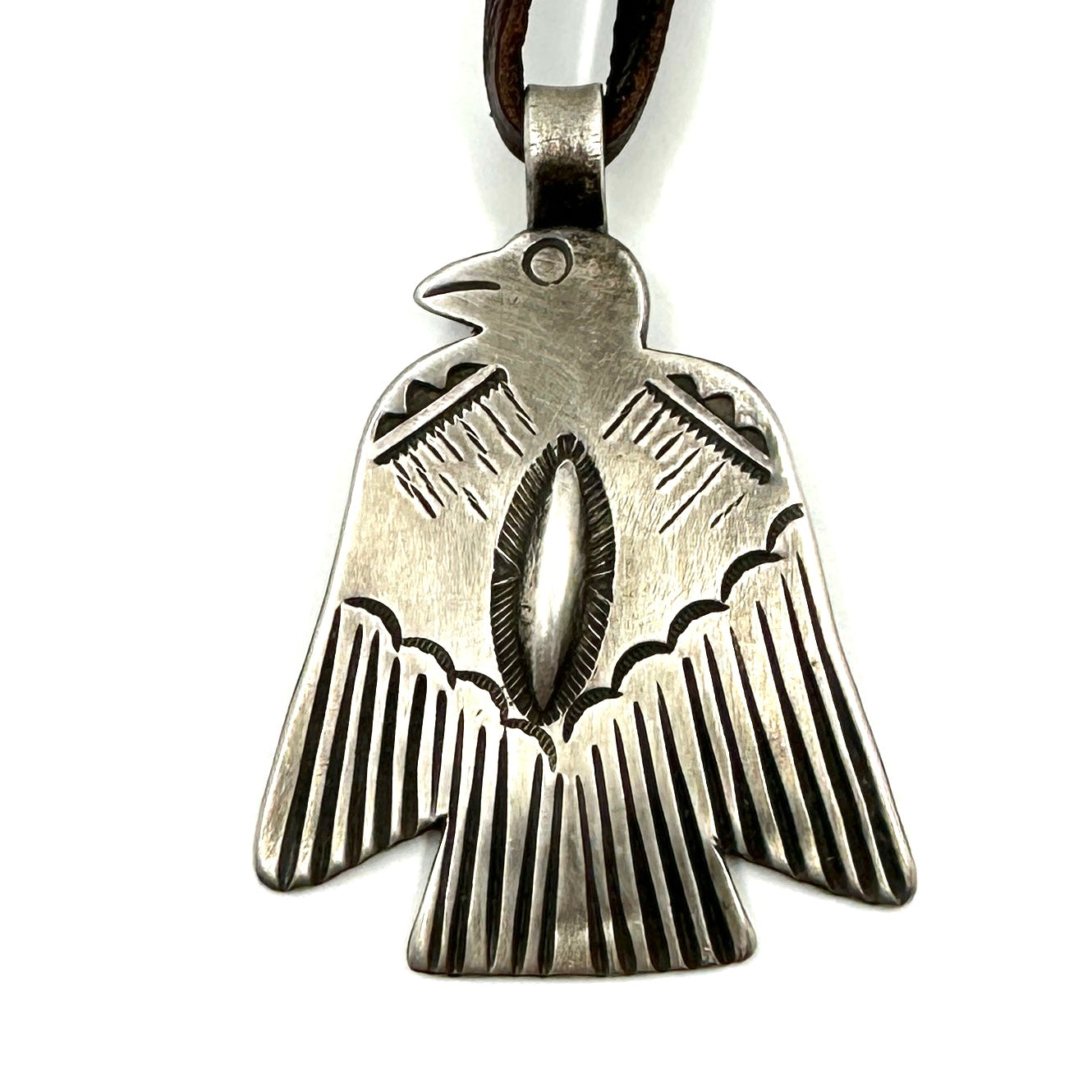 This Thunderbird Pendant is made from hand rolled coin silver ingot and is strung on hand cut deer lace accented with a silver adjustment bead. Thunderbird Size: 1 1/2" wide by...